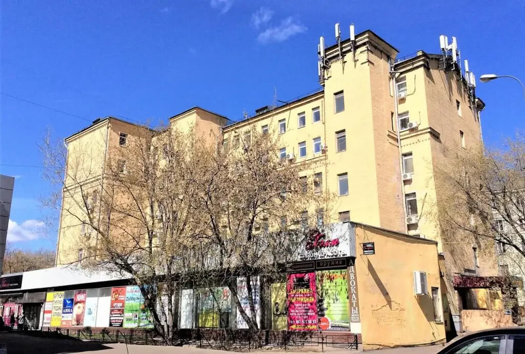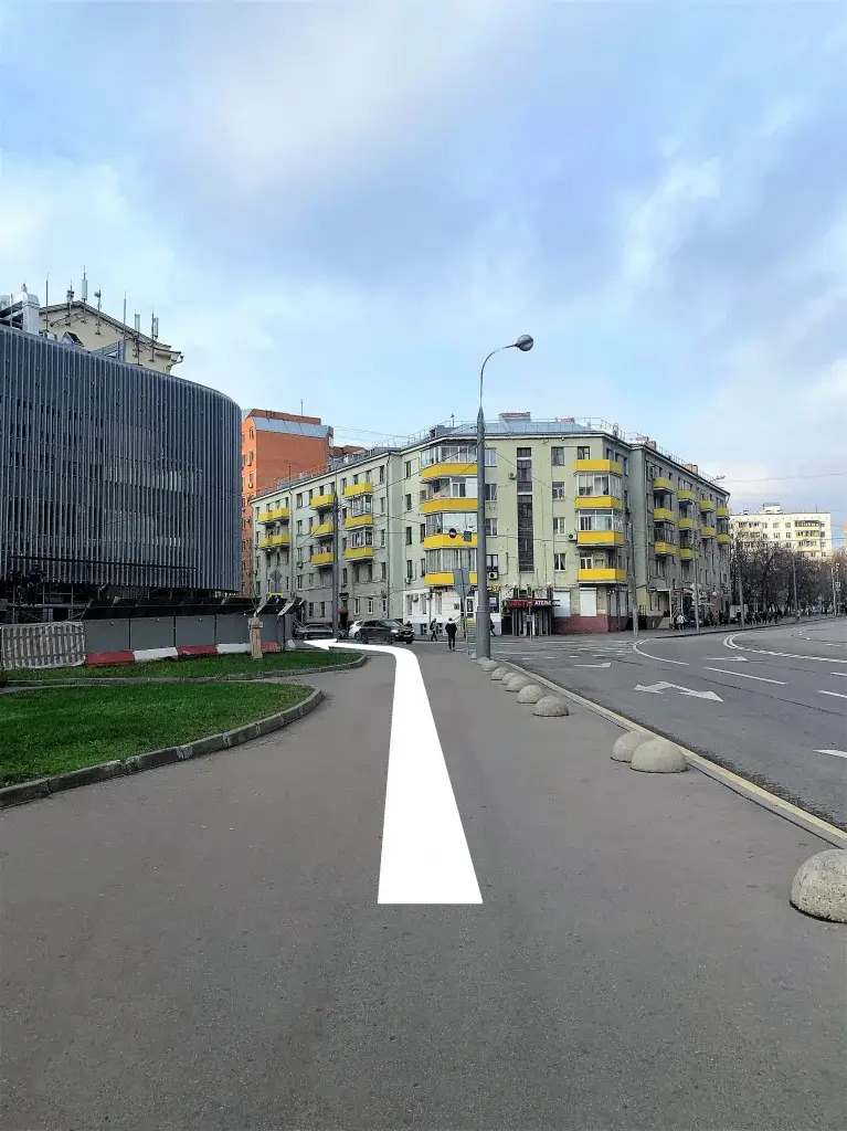 - слева (за строящимся торговым центром) расположено шестиэтажное здание жёлтого цвета
